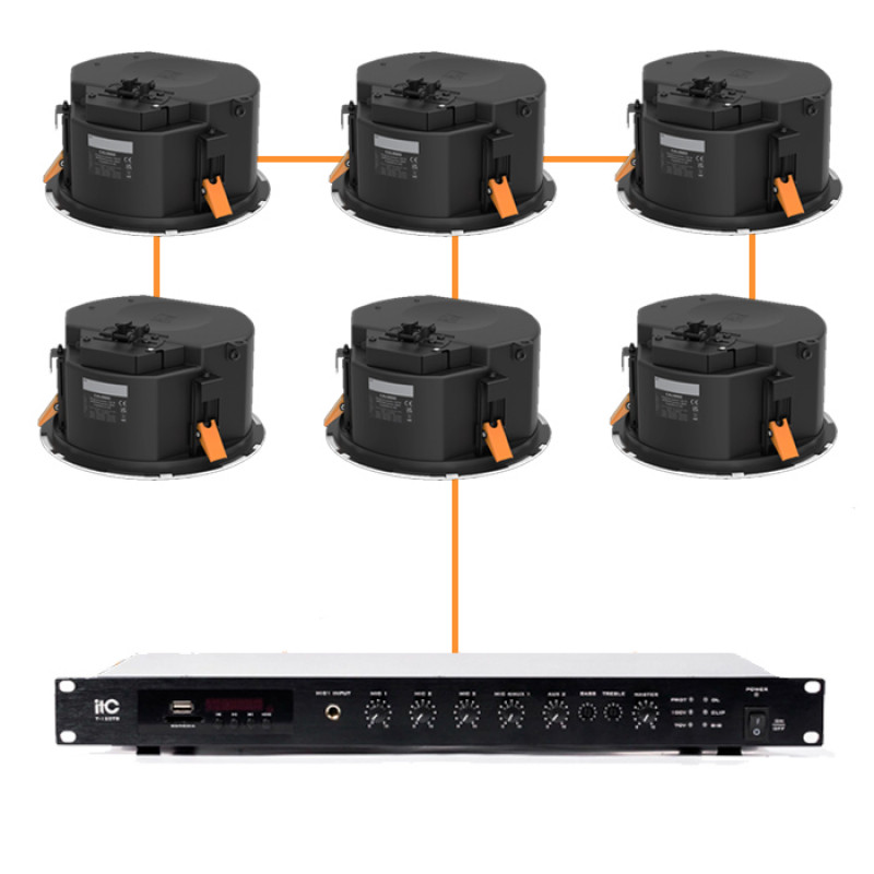 Комплект із флагманської акустики Audac CALI660/W та потужного трансляційного підсилювача ITC T-350DTB є професійним рішенням для створення високоякісного звукового фону в приміщеннях з великою площею або високими стелями.