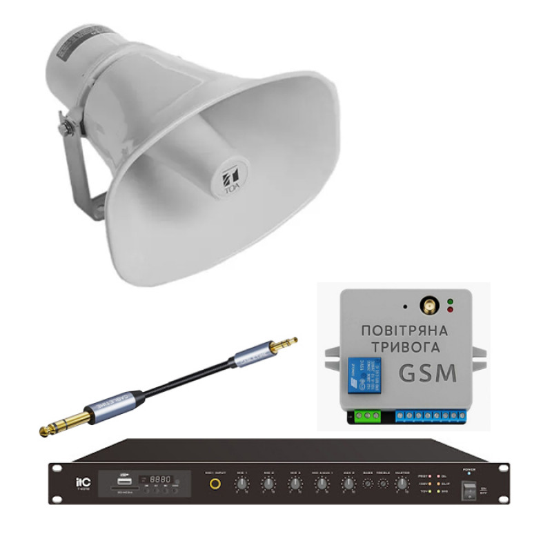 Професійний комплект для автоматизації сигналів цивільного захисту та проведення загальнонаціональної «Хвилину мовчання» . Система складається з трансляційного підсилювача ITC T-120TB (120 Вт) та всепогодного алюмінієвого рупора TOA SC-630M ( 30 Вт) .