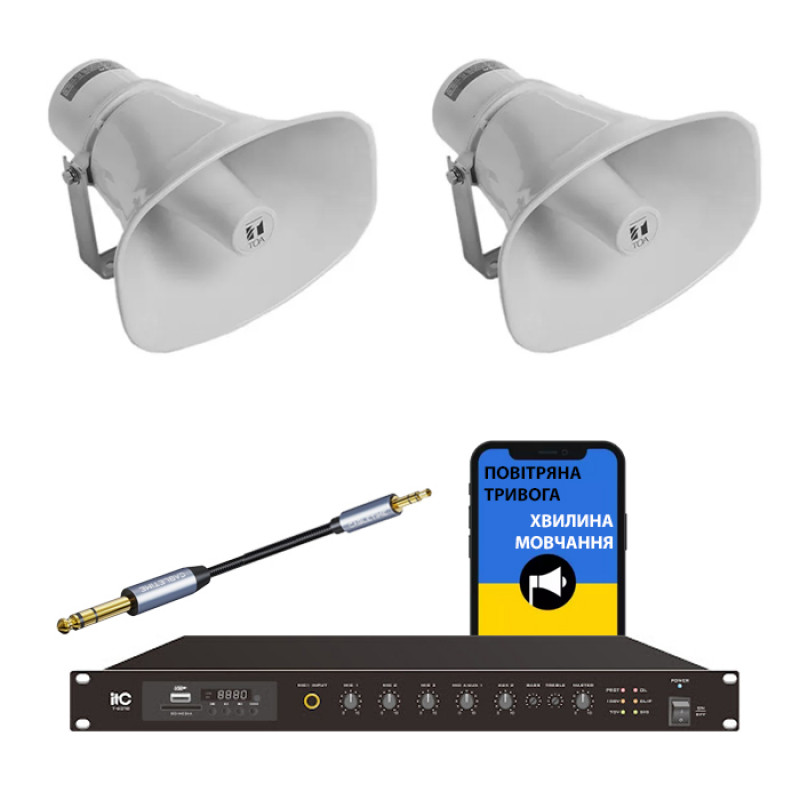 Професійний комплект для автоматизації сигналів цивільної захисту та проведення загальнонаціональної «Минутки мовчання» . Система складається з трансляційного підсилювача ITC T-120TB (120 Вт) та 2 всепогодного алюмінієвого рупора TOA SC-630M (30 Вт) .