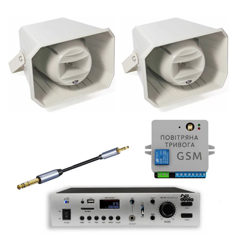 Комплект оповіщення «Повітряна тривога та Хвилина мовчання» на базі GSM контролера, підсилювача 4all Audio PAMP-100-2Z (IZA-100) та 2 рупора ITC T-710K
