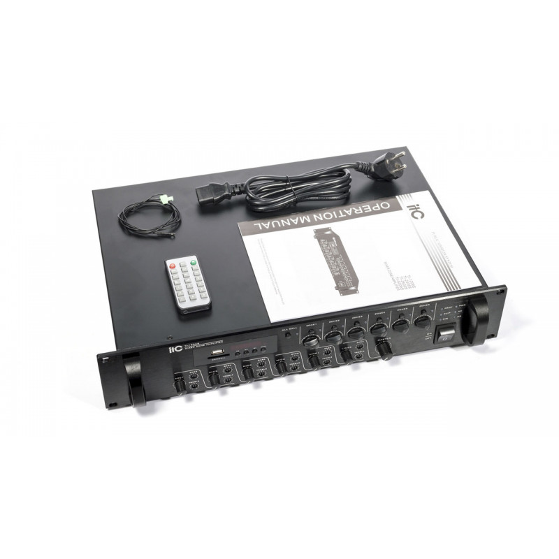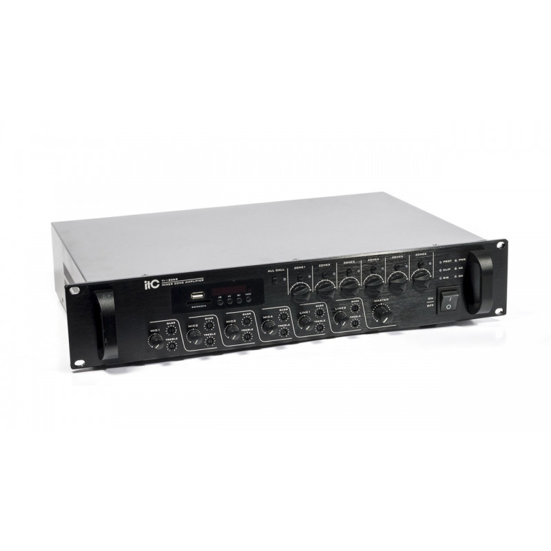 Мікшуючий підсилювач ITC TI-1206S, призначений для підключення джерел звуку та побудови систем озвучування для 6 зон. Підсилювач має USB-вхід, FM-тюнер, Bluetooth, 4 мікрофонні входи, 2 лінійні, захист від короткого замикання, перевантажень і високих температур, 5 рівнів пріоритету.