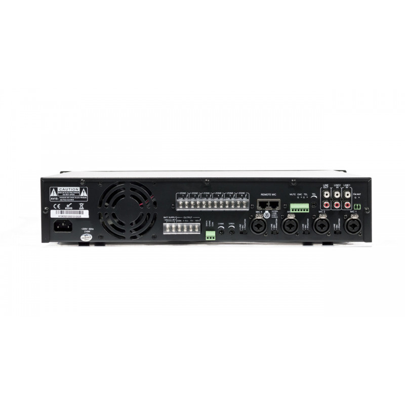 - Подключение громкоговорителей: 70В, 100В и 4 - 16 Ом. 6 зон с регулированием уровня сигнала, низких частот и тембра