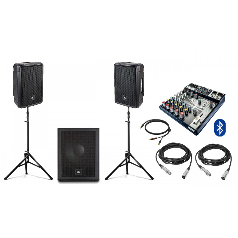 Акустическая система JBL IRX108BT Bluetooth с сабвуфером JBL IRX115S-EK на стойках + микшер | 2x200Вт + 400Вт