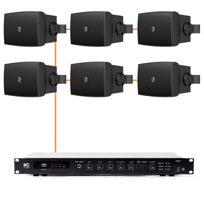 Компактный и функциональный аудиокомплект для настенного монтажа в помещениях до 100–120 м². Включает две двухполосные колонки Audac WX302MK2/B мощностью 20 Вт и микширующий усилитель ITC T-120TB (120 Вт). Система поддерживает Bluetooth, USB и FM-радио, обеспечивая чистый, направленный звук. Отличное решение для небольших кафе, учебных классов, офисов и магазинов, где невозможна установка потолочных динамиков.