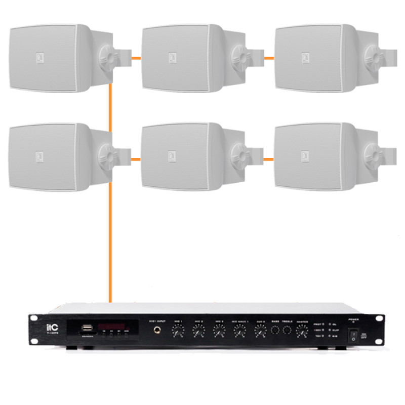 Профессиональная аудиосистема для настенного монтажа, предназначенная для средних торговых залов, кафе и учебных центров. Включает 6 двухполосных колонок Audac WX302MK2/W (по 30 Вт) и мощный трансляционный усилитель ITC T-120TB (120 Вт). Система обеспечивает чистое воспроизведение музыки и высокую разборчивость речи, поддерживает Bluetooth, USB и FM-радио.