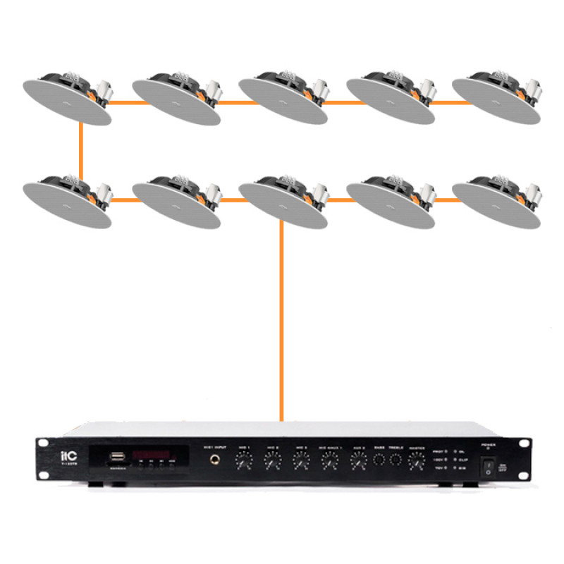 Профессиональный аудиокомплект для помещений площадью до 200 м², требующих детализированного звучания. Включает четыри двухполосные потолочные колонки Audac CIRA724I/W (6.5") с безрамочным дизайном и микширующий усилитель ITC T-240DTB мощностью 240 Вт. Система поддерживает Bluetooth, USB и FM-радио.