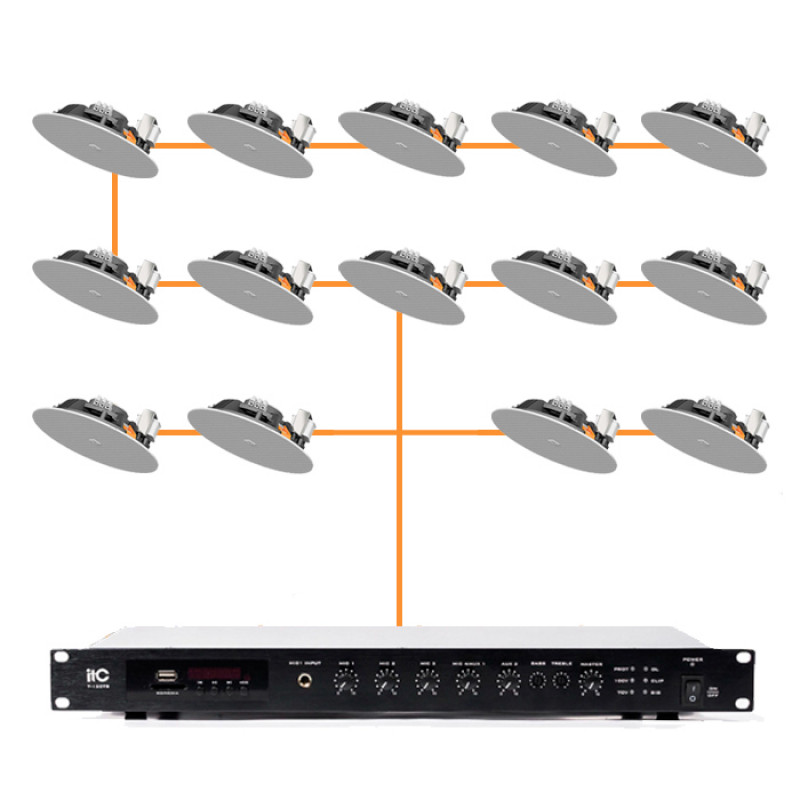 Премиальный акустический комплект для качественного музыкального оформления средних помещений (300 м²). Включает 14 мощные двухполосные колонки Audac CIRA724I/W (6.5") и двухзонный трансляционный усилитель ITC T-350DTB на 350 Вт. Система обеспечивает глубокий, насыщенный звук, поддерживает Bluetooth, USB и FM-радио.