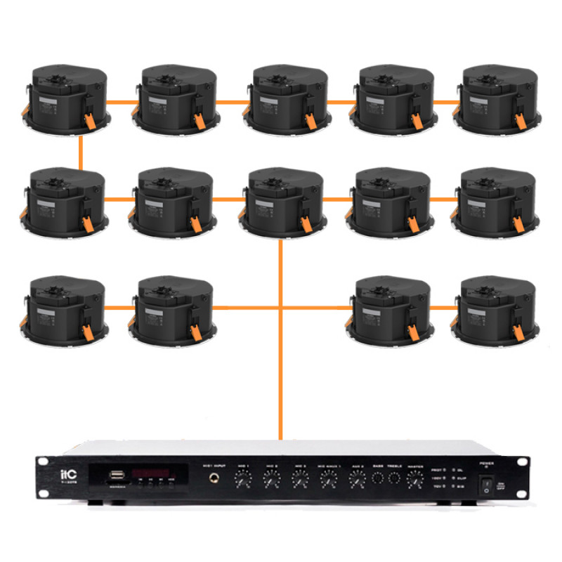 Высококлассный аудиокомплект для небольших коммерческих помещений (до 300 м²). Включает две двухполосные потолочные колонки Audac CALI424I/W (4") с защитным металлическим коробом (Backcan) и микширующий усилитель ITC T-350DTB мощностью 350 Вт. Система обеспечивает детализированное звучание, поддерживает Bluetooth, USB и FM-радио, а также соответствует строгим стандартам безопасности благодаря закрытой конструкции динамиков.