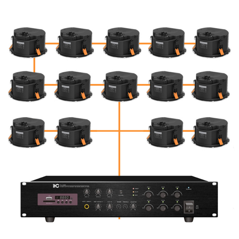 ITC TI-500Z — это «рабочая лошадка» для распределенных аудиосистем. Главная особенность модели — встроенный кнопочный селектор зон на передней панели. С его помощью можно мгновенно включать или выключать трансляцию в любой из пяти групп колонок, что критично для административных и учебных зданий.