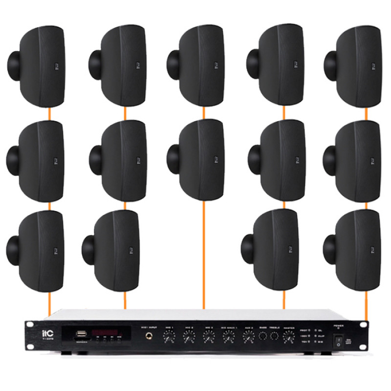 Элегантный настенный аудиокомплект для помещений площадью 220–300 м². Включает две двухполосные дизайнерские колонки Audac ATEO4M (4") мощностью 35 Вт с уникальной системой скрытого монтажа CleverMount™ и микширующий усилитель ITC T-240DTB (120 Вт). Система обеспечивает чистое, детальное звучание, поддерживает Bluetooth, USB и FM-радио. Отличное решение для бутиков, ресторанов и салонов красоты, где важен безупречный внешний вид без видимых проводов.