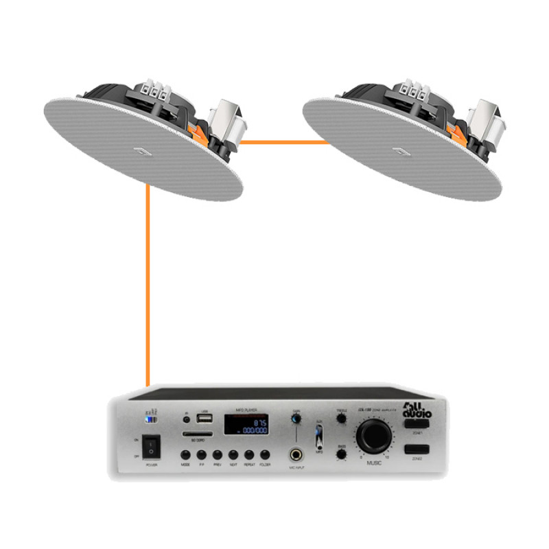 Готовый комплект оборудования, состоящий из двух потолочных колонок Audac CENA706I/W и двухзонного трансляционного усилителя 4all Audio PAMP-60-2Z.
