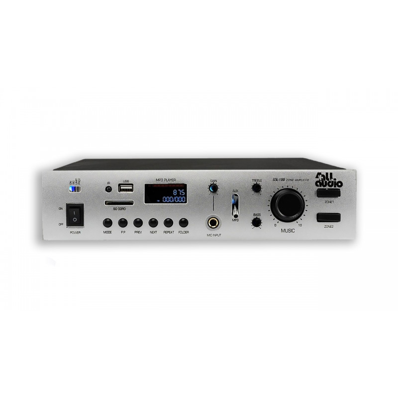 Усилитель 4all Audio PAMP-100-2Z мощностью 100 Вт выступает интеллектуальным центром системы. Он разделен на две независимые зоны вещания с отдельными регуляторами громкости, что позволяет, например, создать разную звуковую атмосферу в основном зале и в зоне отдыха. Встроенный медиаплеер с поддержкой Bluetooth, USB-портов и FM-тюнера делает эксплуатацию системы максимально простой — управлять музыкой можно прямо со смартфона. Наличие микрофонных входов позволяет использовать комплект для оперативных объявлений или проведения небольших мероприятий.