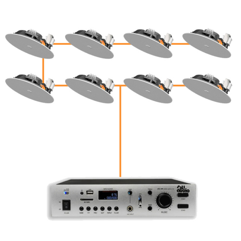 Готовый комплект оборудования, состоящий из 8 потолочных колонок Audac CENA706I/W и двухзонного трансляционного усилителя 4all Audio PAMP-60-2Z.