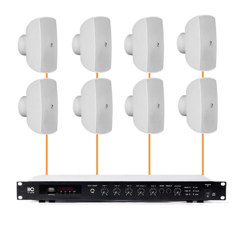 Усилитель ITC T-120TB — это надежный «двигатель» системы мощностью 120 Вт. Он обладает значительным запасом энергии, что позволяет при необходимости подключить еще 2–4 аналогичные колонки в будущем. Устройство оснащено встроенным MP3-плеером и Bluetooth-модулем для беспроводного стриминга музыки. Развитая система коммутации включает несколько микрофонных и линейных входов с индивидуальной регулировкой громкости, что делает его универсальным инструментом как для проигрывания плейлистов, так и для передачи объявлений.