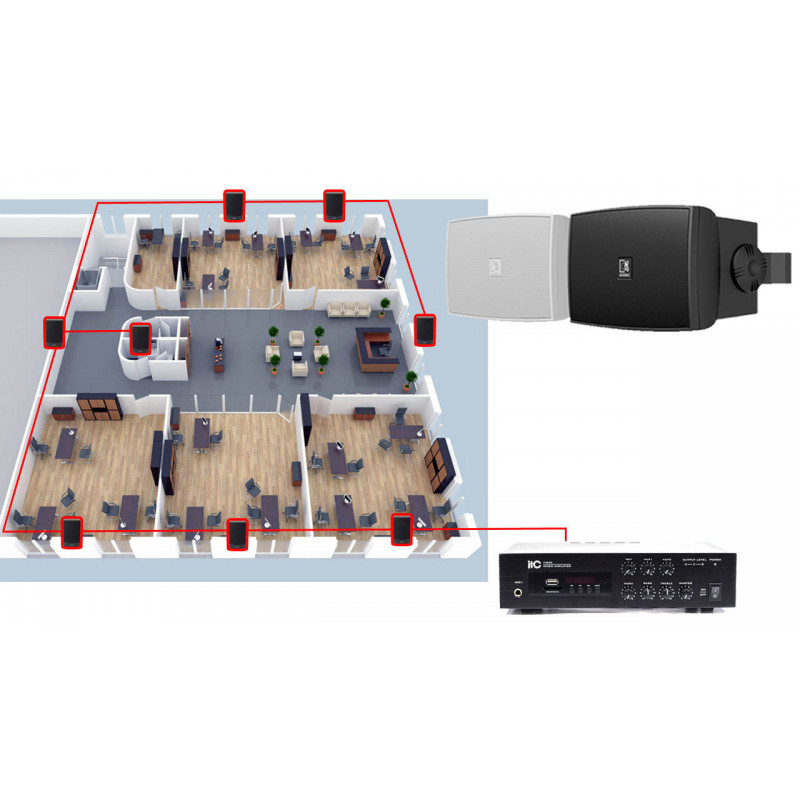 Комплект акустики для офиса, фоновой музыки, комплект акустики для офиса 20Вт настенные колонки AUDAC. Музыка с флешки USB, карты памяти SD, или блютуз с телефона.
