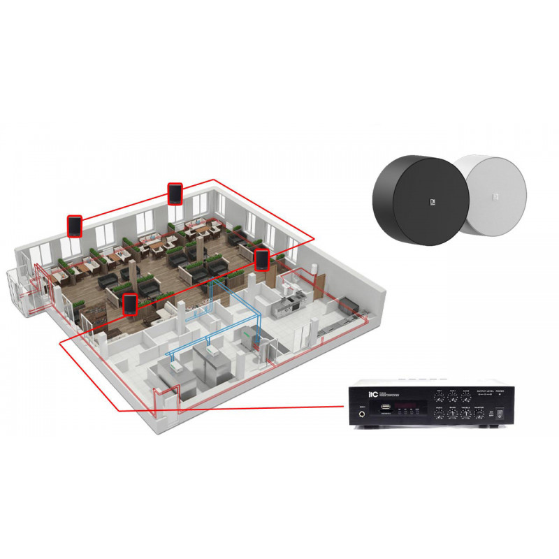 Комплект акустики для офиса, фоновой музыки, комплект акустики для ресторана, кафе 24Вт настенные колонки AUDAC. Музыка с флешки USB, карты памяти SD, или блютуз с телефона.