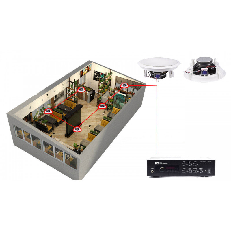 Для фоновой музыки, комплект акустики 30Вт для кафе, ресторана 5 потолочных динамиков BOSCH. Музыка с флешки USB, карты памяти SD, или блютуз с телефона