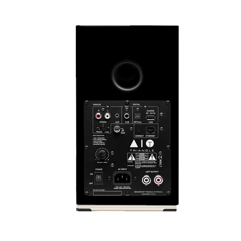 Колонки Triangle AIO TWIN оснащены двумя аналоговыми входами, один из которых может работать в линейном или Phono-режимах для возможности подключения проигрывателя винила. Также в акустике имеется оптический вход, который можно использовать для подключения Triangle AIO TWIN к телевизору для качественного воспроизведения звукового сопровождения телепередач и кинофильмов. Беспроводные технологии в данной модели представлены Bluetooth с поддержкой aptX, aptX HD, aptX LL и AAC, а также Wi-Fi (DLNA).