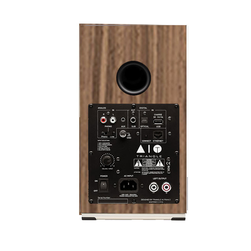Колонки Triangle AIO TWIN оснащены двумя аналоговыми входами, один из которых может работать в линейном или Phono-режимах для возможности подключения проигрывателя винила. Также в акустике имеется оптический вход, который можно использовать для подключения Triangle AIO TWIN к телевизору для качественного воспроизведения звукового сопровождения телепередач и кинофильмов. Беспроводные технологии в данной модели представлены Bluetooth с поддержкой aptX, aptX HD, aptX LL и AAC, а также Wi-Fi (DLNA).