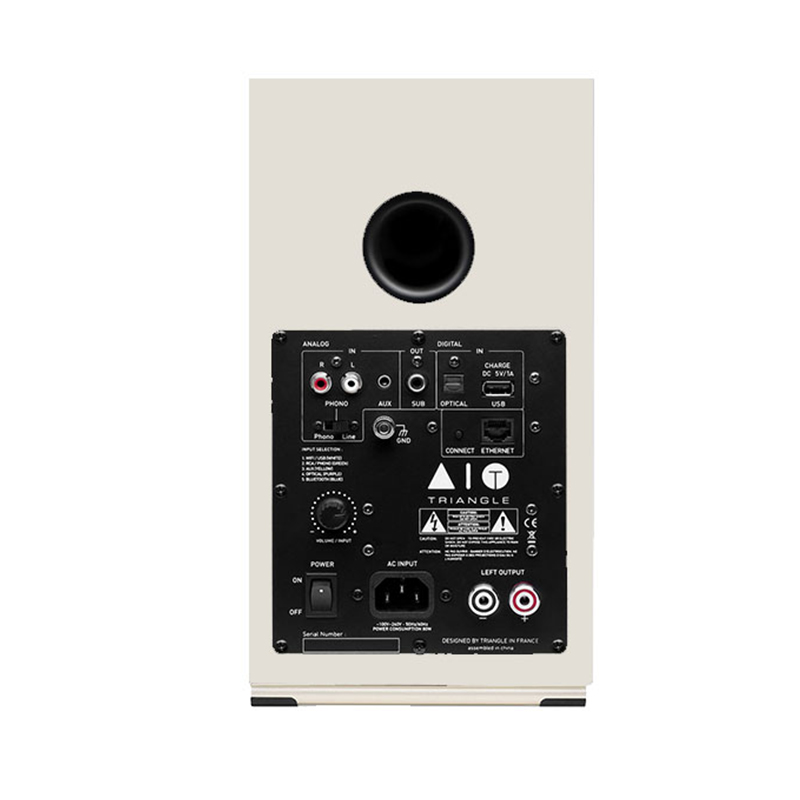 Колонки Triangle AIO TWIN оснащены двумя аналоговыми входами, один из которых может работать в линейном или Phono-режимах для возможности подключения проигрывателя винила. Также в акустике имеется оптический вход, который можно использовать для подключения Triangle AIO TWIN к телевизору для качественного воспроизведения звукового сопровождения телепередач и кинофильмов. Беспроводные технологии в данной модели представлены Bluetooth с поддержкой aptX, aptX HD, aptX LL и AAC, а также Wi-Fi (DLNA).