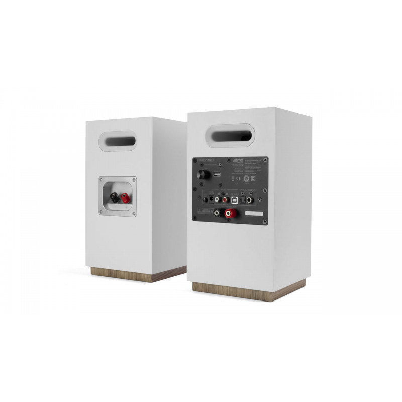 Из выходов, кроме вполне серьезных акустических терминалов для подключения пассивной колонки, присутствует RCA-разъем для подачи сигнала на активный сабвуфер. Кроме того, S 801 PM может принимать потоковую передачу по Bluetooth. Активную колонку из комплекта Jamo Studio S 801 PM отличает наличие круглого окна ИК-приемника пульта ДУ на передней панели. В системах установлены 1-дюймовые твитеры с мягким куполом, дополненные технологией WaveGuide для улучшения динамики и качества звука. Драйверы СЧ/НЧ получили алюминированные диффузоры из полифибры. Постоянная мощность систем — до 24 Вт в канале.