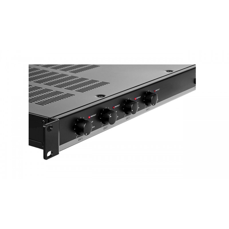 Данный усилитель выполнен в компактном рэковом корпусе размером всего 1 юнит. Он прекрасно подходит для озвучивания репетиционных студий, а так же небольших кафе, баров или ресторанов. На его передней панели традиционно расположены 4 регулятора громкости (на каждый канал соответственно), светодиодные индикаторы и кнопка включения / выключения питания.