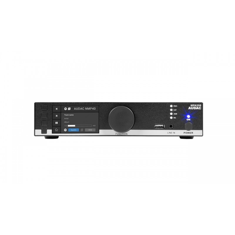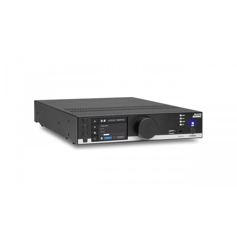 Основной отличительной особенностью AUDAC MFA208 является наличие фирменного SourceCon™ интерфейса для подключение опциональных модулей, которые позволяет превратить данный усилитель в сетевой медиаплеер с поддержкой интернет радио и других современных функций. Управление MFA208 производится по TCP/IP протоколу при помощи фирменного приложения AUDAC Touch™ для iOS и Android устройств. Также имеются физические органы управления и большой 2.8'' TFT-дисплей для отображения текущей информации (меню настроек, проигрываемый трек и т.п.). Из физических выходов имеются RS232 и RS485 (для управления), приоритетный релейный выход, 4 pin EuroBlock терминал для подключения громкоговорителей и линейный Jack выход. Из входов присутствуют Ethernet интерфейс, а также микрофонные балансный и небалансный входы с поддержкой фантомного питания 15 В.