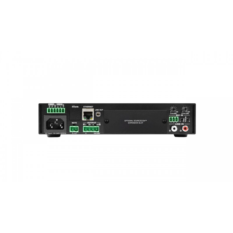 AUDAC MFA208 – это трансляционный усилитель мощности, который идеально подойдет для построения распределенных систем оповещения и фонового озвучивания на объектах любого масштаба, включая кафе, рестораны, офисы, магазины, бары и т.п. Выполнен в компактном металлическом корпусе, благодаря чему его можно легко установить в любую нишу или закрепить в 19” RACK стойку (Rackmount крепление в комплект не входят). Оснащен встроенным блоком питания с широким диапазоном входного напряжения от 100 до 240 В AC, то есть будет работать практически от любой сети переменного напряжения. Построен на архитектуре класса D, имеет максимальную выходную мощность 2х 40 Вт (стерео) в низкоомном режиме 4 Ом или 2х 20 Вт (стерео) в режиме 8 Ом. Также поддерживается подключение трансформаторных громкоговорителей для работы в линии 70/100 В при этом выходная мощность составляет 80 Вт (Bridge).