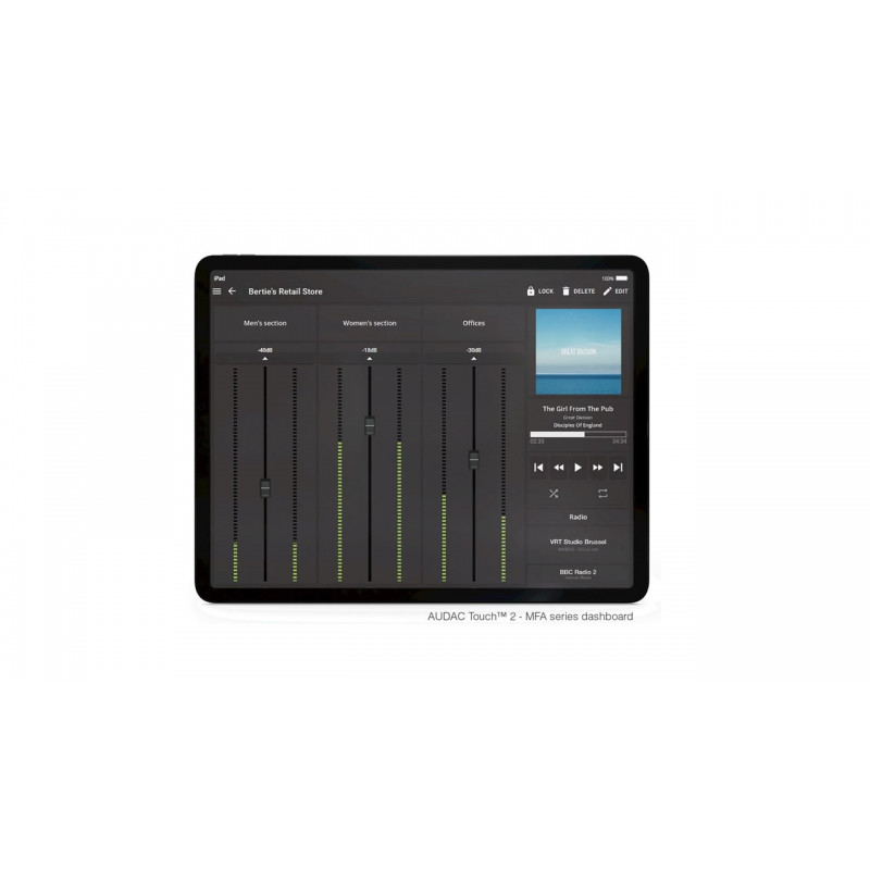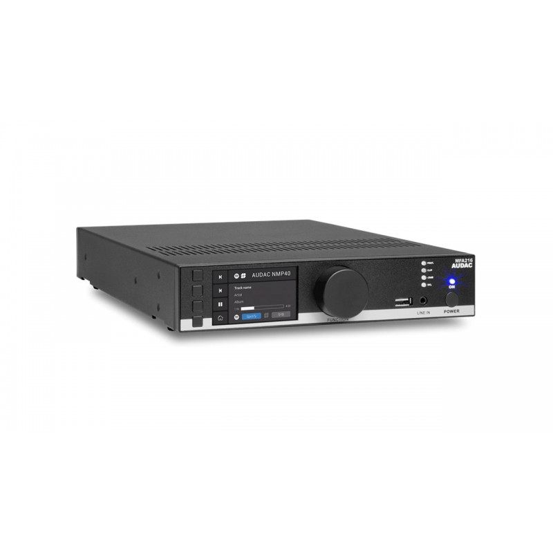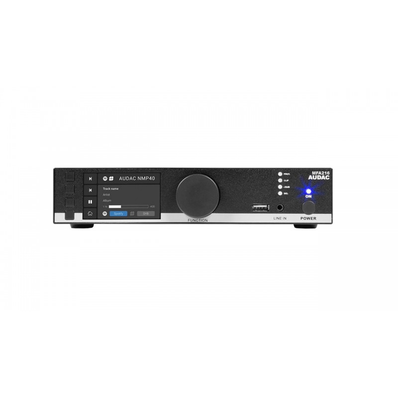 Основной отличительной особенностью AUDAC MFA216 является наличие фирменного SourceCon™ интерфейса для подключение опциональных модулей, которые позволяет превратить данный усилитель в сетевой медиаплеер с поддержкой интернет радио и других современных функций. Управление MFA208 производится по TCP/IP протоколу при помощи фирменного приложения AUDAC Touch™ для iOS и Android устройств. Также имеются физические органы управления и большой 2.8'' TFT-дисплей для отображения текущей информации (меню настроек, проигрываемый трек и т.п.). Из физических выходов имеются RS232 и RS485 (для управления), приоритетный релейный выход, 4 pin EuroBlock терминал для подключения громкоговорителей и линейный Jack выход. Из входов присутствуют Ethernet интерфейс, а также микрофонные балансный и небалансный входы с поддержкой фантомного питания 15 В.